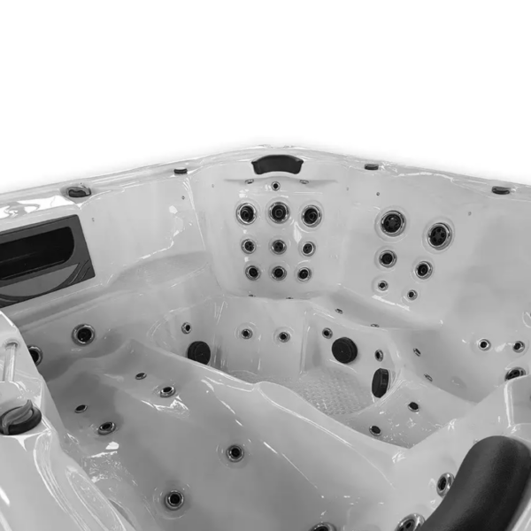 Wnętrze modelu Manhattan to majstersztyk ergonomii. Jedna leżanka (lounger) to strefa pełnego odprężenia w pozycji półleżącej, oferująca masaż całego ciała od stóp do głów. Pozostałe 5 miejsc siedzących zapewnia swobodną przestrzeń do integracji i wspólnych rozmów w 1670 litrach ciepłej wody. Każde stanowisko oferuje nieco inny układ dysz, co pozwala uczestnikom kąpieli na rotację i korzystanie z różnych technik masażu. Niecka Aristech® Acrylic (USA) charakteryzuje się wyjątkową gładkością i trwałością, co sprawia, że kontakt ze skórą jest niezwykle przyjemny, a samo jacuzzi prezentuje się nieskazitelnie w każdych warunkach oświetleniowych.
