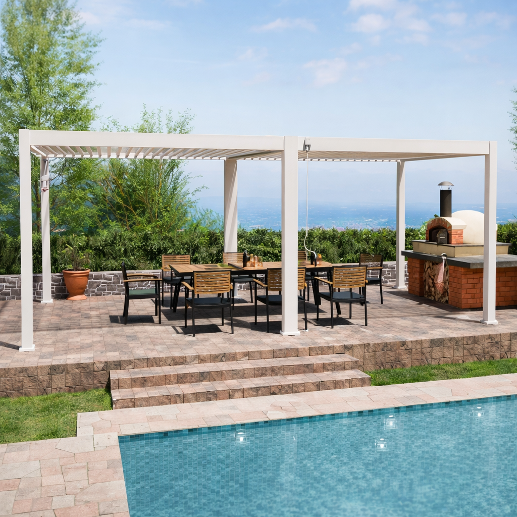 Panel shutters pozwala zachować nowoczesny design pergoli, jednocześnie poprawiając jej funkcjonalność.
