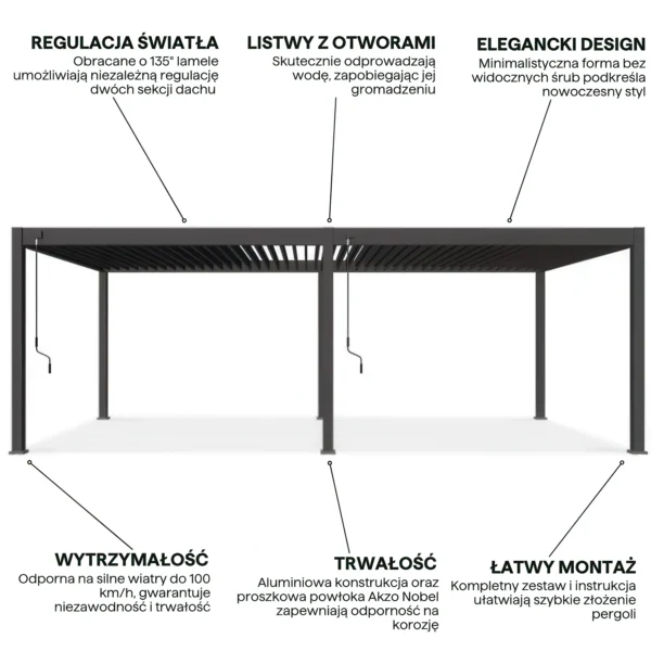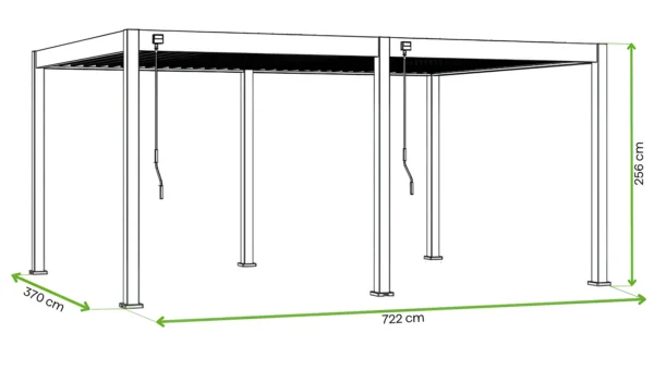 Jeśli potrzebujesz dużej pergoli aluminiowej 3,6 x 7,2 m z regulowanym dachem lamelowym, ten model zapewni wygodę użytkowania oraz nowoczesny charakter przestrzeni zewnętrznej.