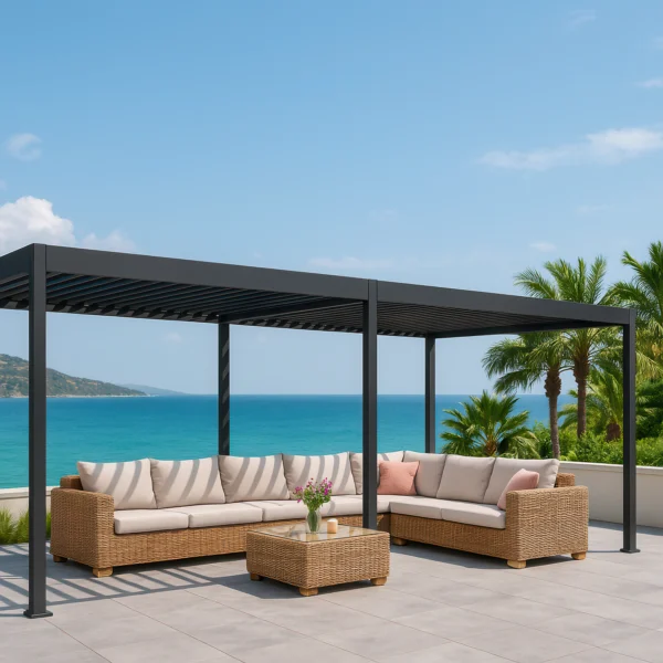 Duża pergola aluminiowa Deluxe to propozycja dla osób, które oczekują trwałego zadaszenia o wysokich parametrach technicznych i eleganckiej formie. Dzięki swojej konstrukcji model tworzy stabilną, estetyczną przestrzeń wypoczynkową, która zwiększa funkcjonalność tarasu i wartość nieruchomości.