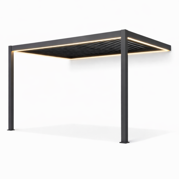Wbudowane oświetlenie LED nadaje przestrzeni wyjątkowy charakter i sprawia, że pergola doskonale sprawdza się również wieczorem. Możliwość regulacji światła (np. przez aplikację) pozwala stworzyć idealną atmosferę – od relaksu po spotkania towarzyskie.