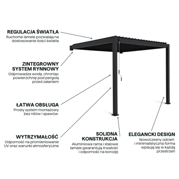 Napisz pierwszą opinię o „Pergola Aluminiowa Ogrodowa 300×400 cm LOOK – Ścienna, Stalowe Lamele”