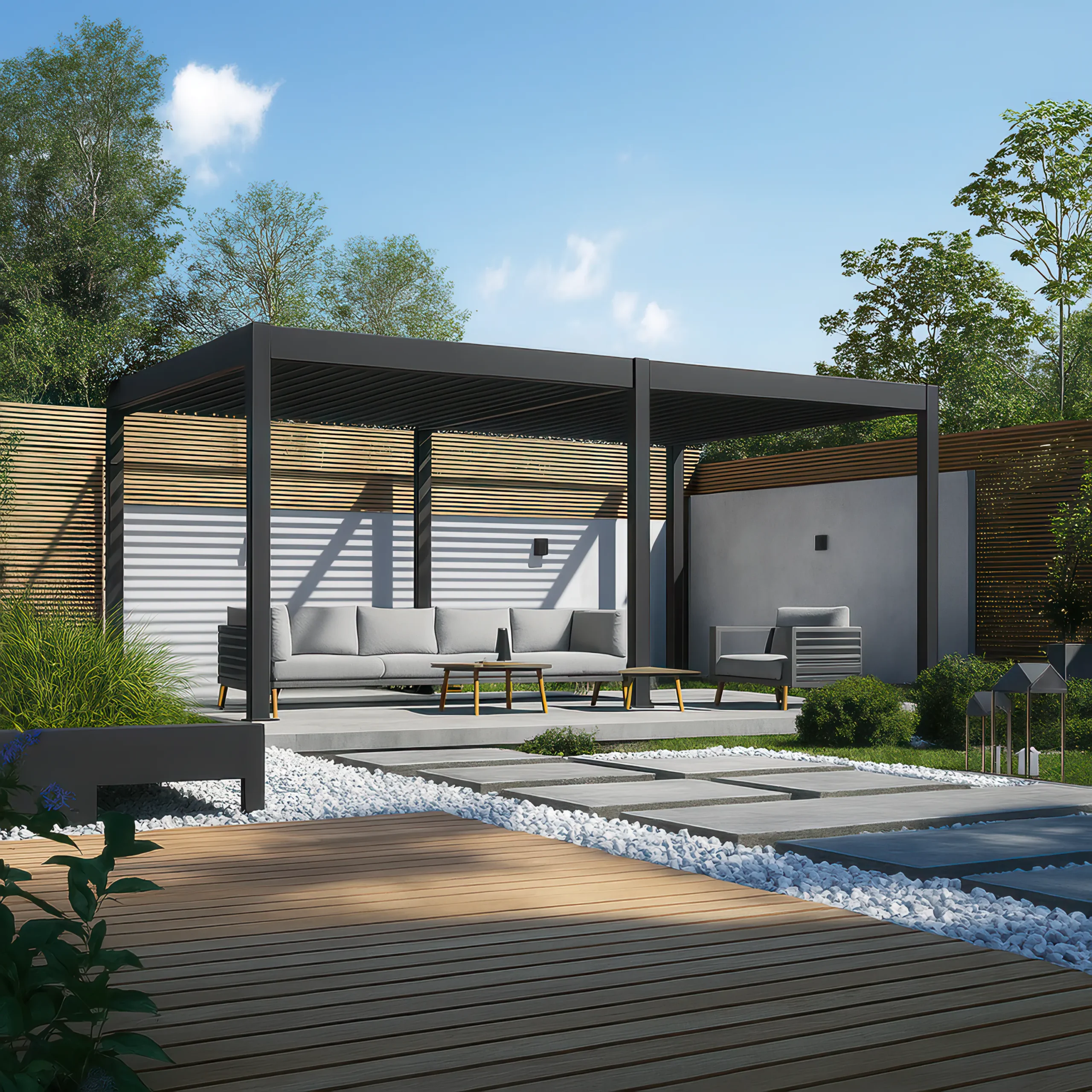 To wolnostojąca pergola bioklimatyczna z elektrycznie sterowanym dachem i oświetleniem LED, zaprojektowana z myślą o użytkowaniu całorocznym. Doskonale sprawdzi się zarówno przy domu jednorodzinnym, jak i w restauracjach czy hotelowych strefach relaksu.