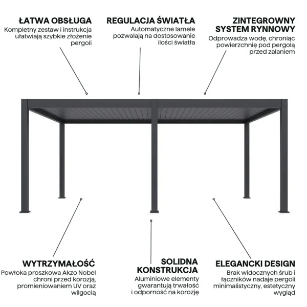 Jeśli szukasz trwałej, eleganckiej i w pełni funkcjonalnej pergoli wolnostojącej z elektrycznym dachem i LED – ten model będzie doskonałym wyborem.