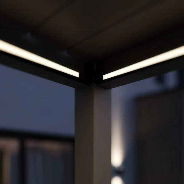 Zintegrowane podświetlenie dachu LED zwiększa funkcjonalność pergoli po zmroku.
