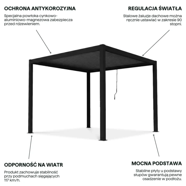 Konstrukcja pergoli została wykonana z wysokiej jakości stali, co zapewnia wyjątkową stabilność oraz długą żywotność produktu. Zastosowanie powłoki ochronnej cynkowo-aluminiowo-magnezowej skutecznie zabezpiecza elementy przed korozją, dzięki czemu pergola doskonale sprawdzi się przez wiele sezonów – nawet w wymagających warunkach atmosferycznych.