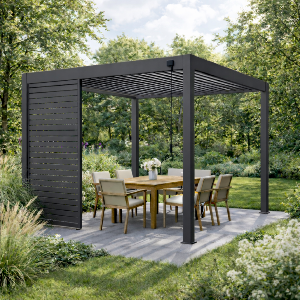 Manualne sterowanie umożliwia szybką zmianę kąta nachylenia lameli, dzięki czemu przestrzeń pod pergolą staje się bardziej funkcjonalna przez cały sezon.