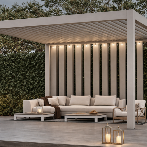 Pionowa ściana uchylna do pergoli RAL 7032 – funkcjonalność w jasnym tonie
